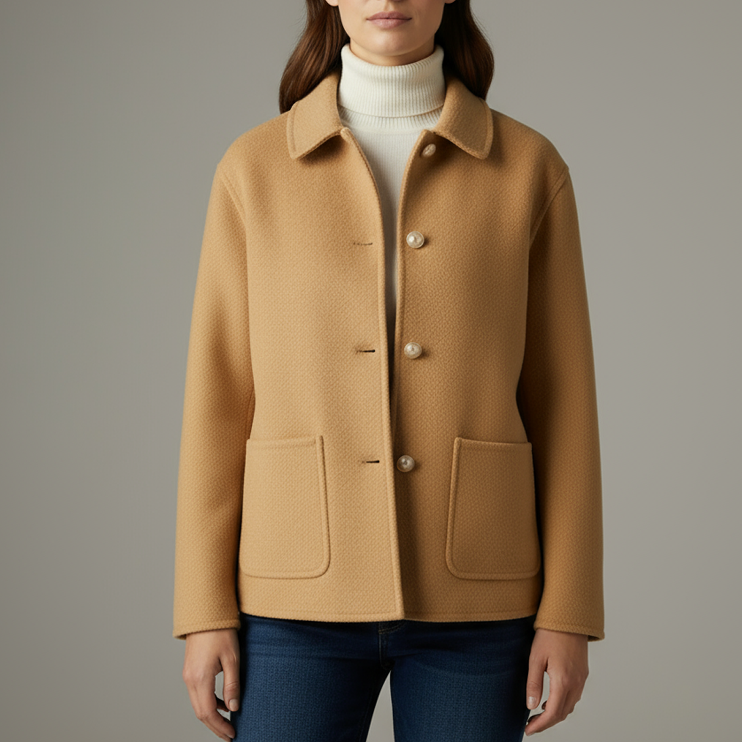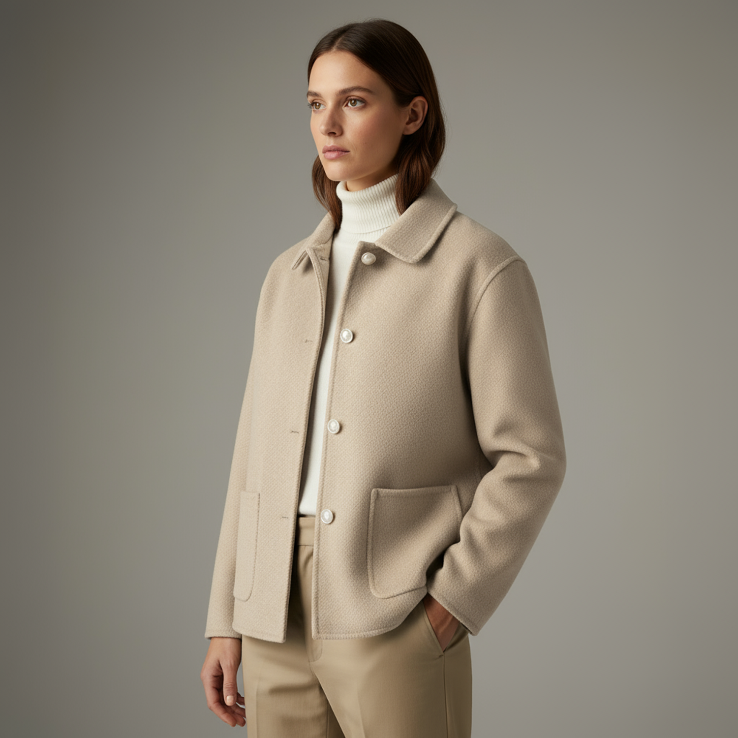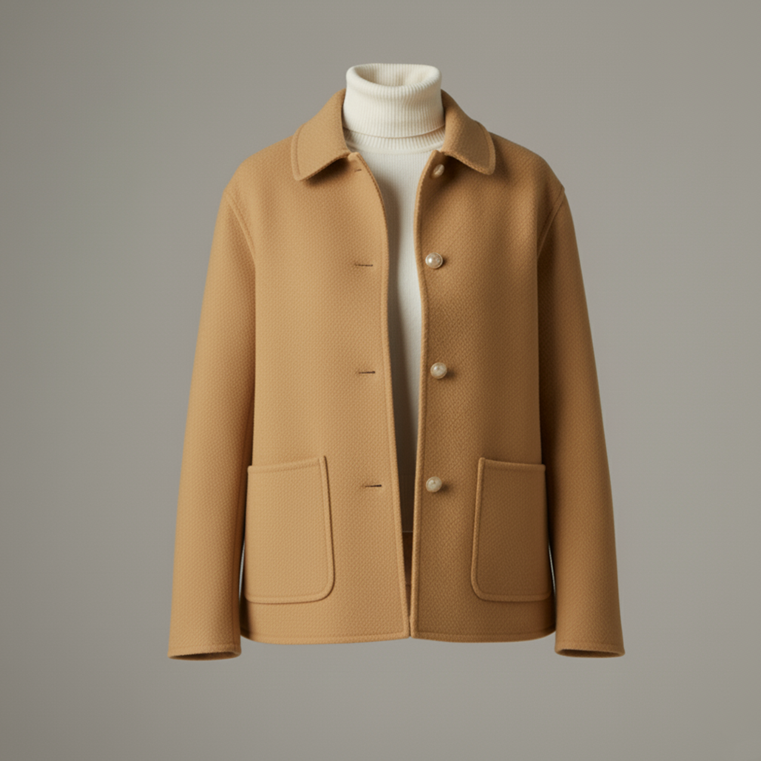 Tailored from pure cashmere, this short coat drapes with serene precision. The rounded collar and sculpted silhouette whisper of timeless grace — soft to the touch, powerful in presence, and made to move with quiet confidence.
